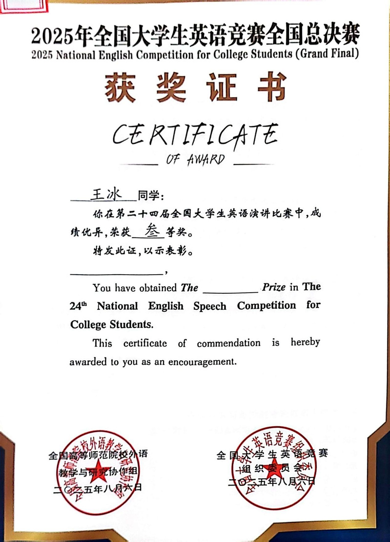 8月2日至7日,2025年全国大学生英语竞赛(NECCS)全国总决赛在河南郑州举行。我院汽车服务工程2024级学生王冰获英语演讲比赛三等奖。