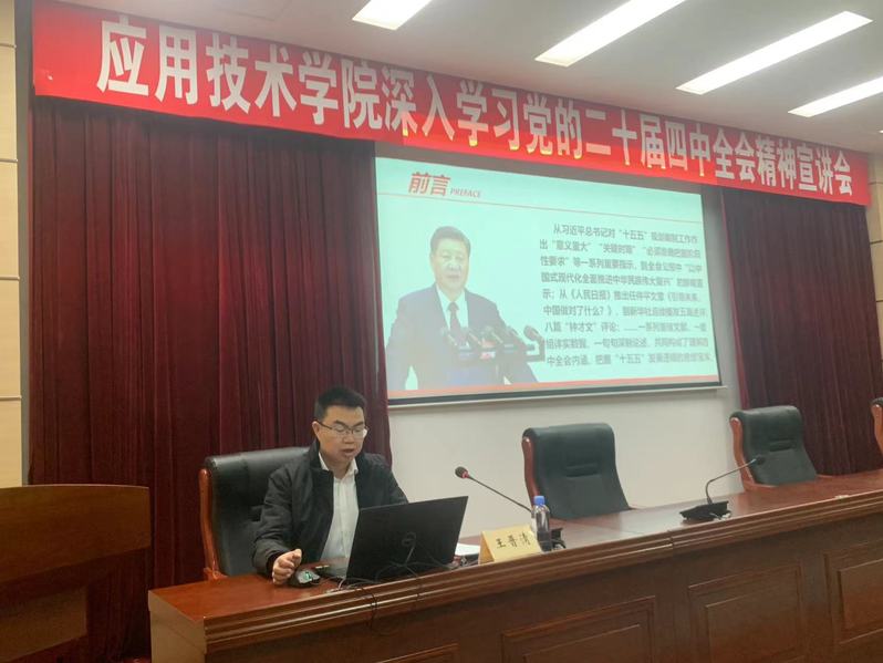 为深入学习贯彻党的二十届四中全会精神,精准把握“十五五”规划战略部署,1月7日,学院在119报告厅举办专题党课,学院党委副书记(主持工作)王晋清作宣讲报告,全体教职工党员参加会议。